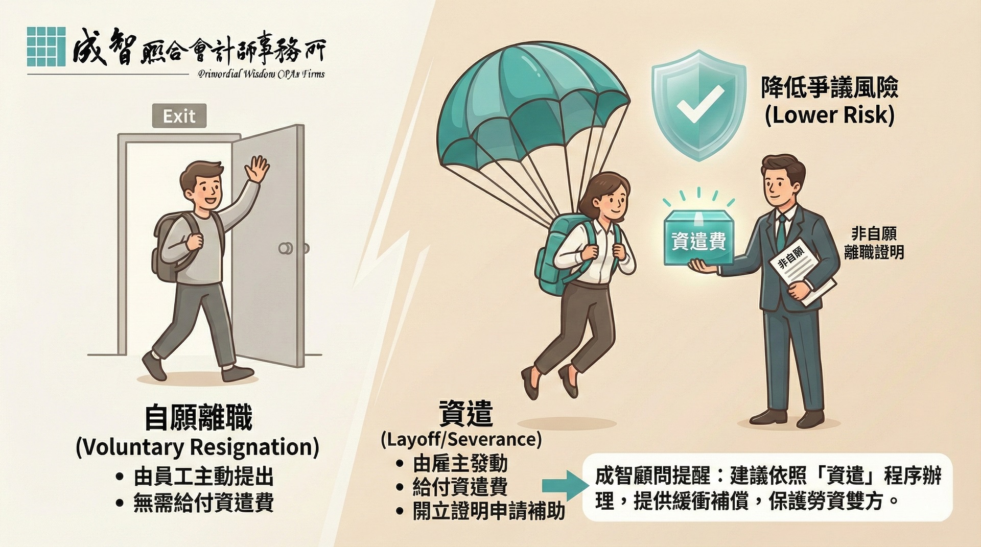 - 資遣(非自願離職): 這是由雇主發動的(如業務緊縮、不適任等)。企業必須給付資遣費,並開立證明讓員工申請失業補助。
