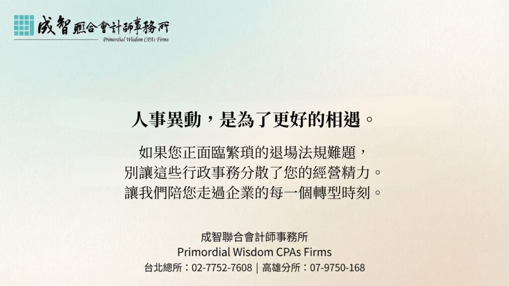 如果您對於勞資法規與稅務申報的銜接仍有疑慮,或是希望針對家族企業進行更深度的資產配置健康檢查,成智聯合會計師事務所隨時準備好為您提供專業的諮詢與協助,為您的財富傳承把關。