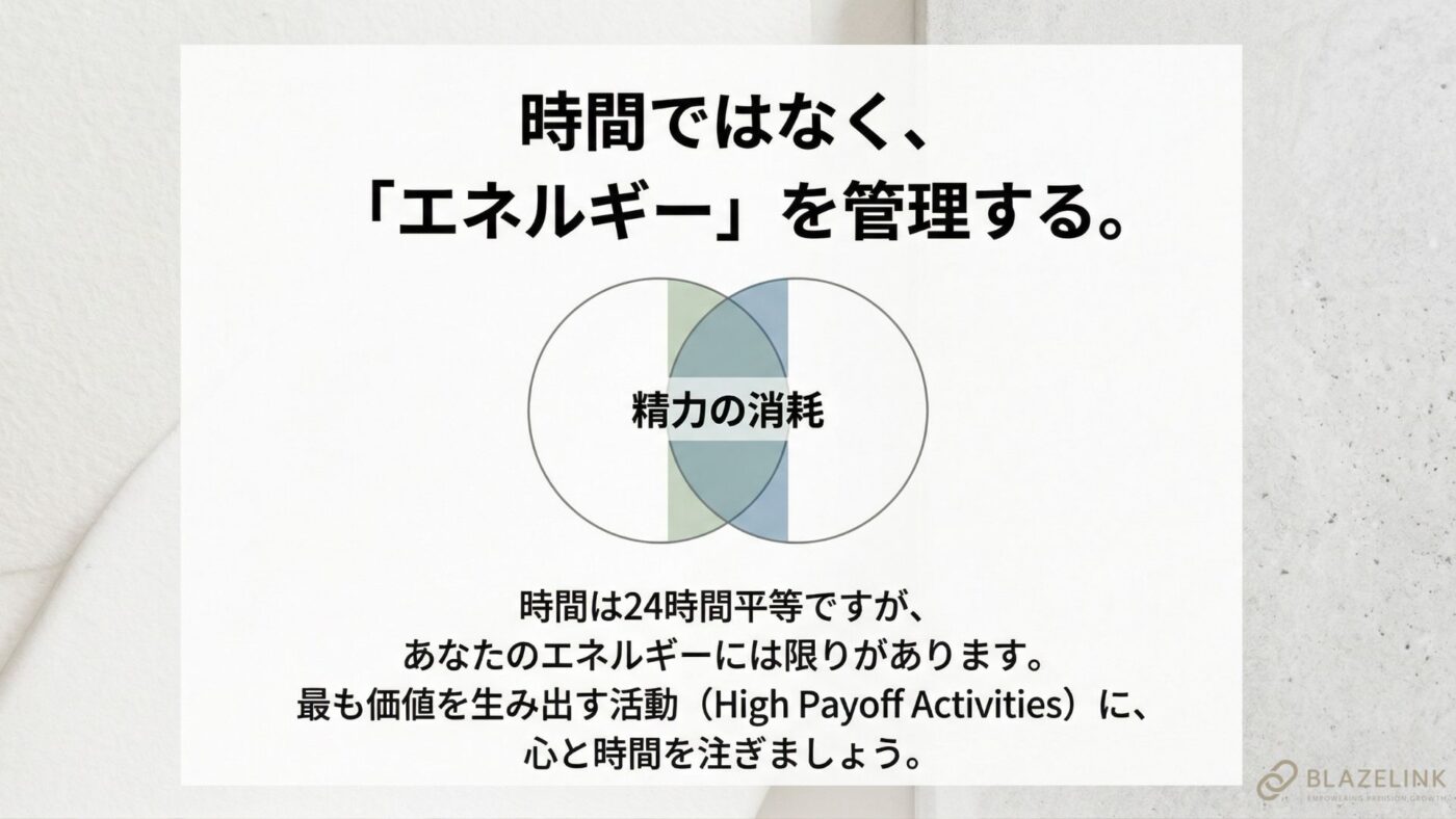 私たちはよく「どうすればもっと効率よく時間を使えるか」というタイムマネジメントの罠に陥りがちです。しかし、本当に目を向けるべきは「時間」ではなく「エネルギー」です。時間は誰にでも平等に24時間ありますが、あなたのエネルギーには明確な限りがあり、感情の波があります。