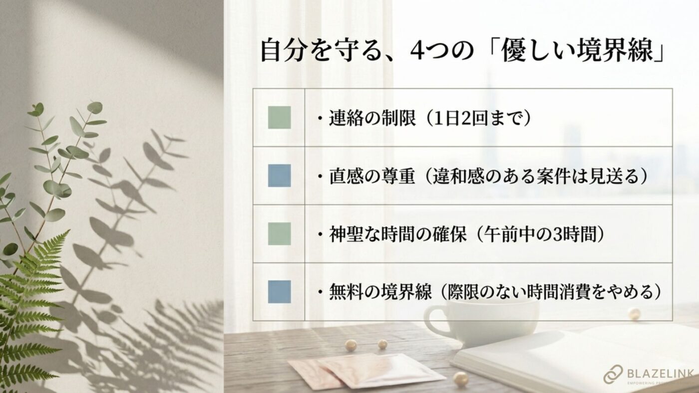 長く、心地よく、そしてエレガントにビジネスを続けていくためには、自分自身を守るための「優しい境界線(バウンダリー)」が必要です。